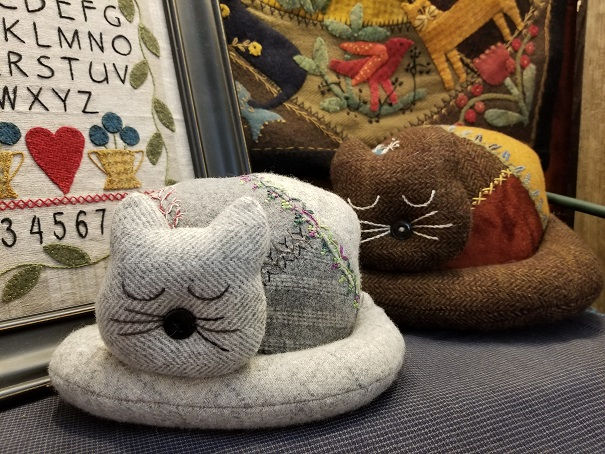 Sew Cherished Crazy cats are great projects and so fun to place around the house. Prop open a door, place in a window seal or cozying up together on a couch pillow. Pattern includes a page of regular size water soluble crazy stitches as well as our petite size. This kit includes enough wool for one of the cats. Available in brown calico, gray, or black wool kit along with your Crazy Cats pattern.