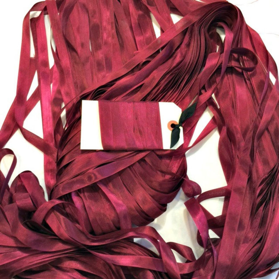 hand-dyed 9/16" wide ribbon, 100% viscose, 3 continuous yards presented in a glassine bag.